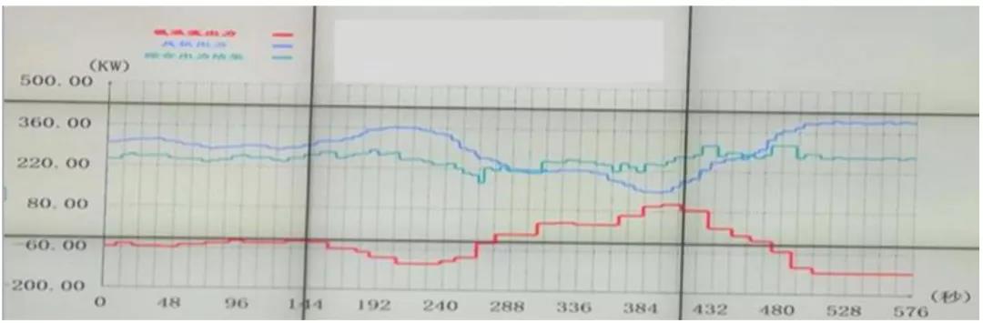 上圖是通過釩液流儲能來平抑風(fēng)電的情況,藍(lán)色是風(fēng)電的出力曲線,紅色是儲能的出力曲線,綠色是兩者設(shè)備平滑后總的出力情況。