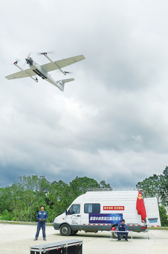 因廣東省陽江市部分地區(qū)遭受水災(zāi),道路淹沒阻礙搶修復(fù)電作業(yè),在廣東電網(wǎng)機(jī)巡作業(yè)中心的指揮下,廣東省輸變電工程公司派出8架固定翼無人機(jī),在全國首次開展“套耕式”大規(guī)模勘災(zāi)搶險(xiǎn),本次制定的“W形航行線路”區(qū)別于以往單點(diǎn)單線的作業(yè)方式,可全方位多角度更精確地勘查線路受損位置等情況,大大提高災(zāi)后巡檢效率。圖為9月18日,CW—20垂直起降固定翼無人機(jī)升空?qǐng)?zhí)行勘災(zāi)任務(wù)。 南網(wǎng)報(bào)記者 賴增鵬 通訊員 楊惠平 陳澤鵬 攝