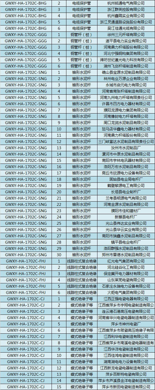 國網(wǎng)河南電力2017年第二次配網(wǎng)設(shè)備協(xié)議庫存貨物招標(biāo)活動中標(biāo)候選人結(jié)果:國網(wǎng)河南電力2017年第二次配網(wǎng)線路材料協(xié)議庫存貨物招標(biāo)中標(biāo)候選人結(jié)果: