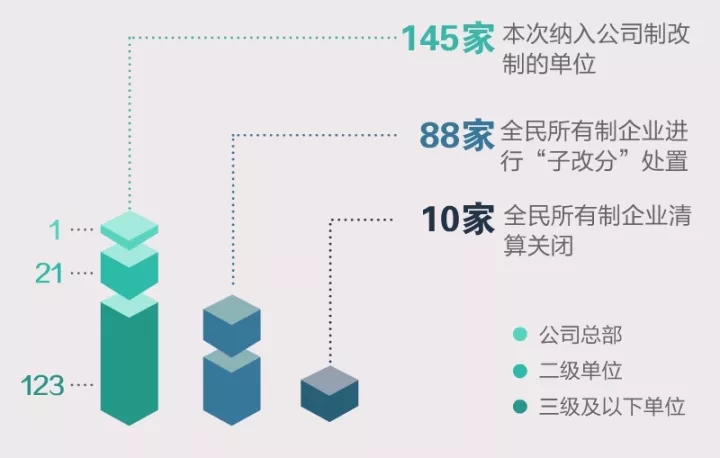 包括公司總部,本次納入公司制改制的單位有145家,其中二級(jí)單位21家,三級(jí)及以下單位123家。此外,還有88家全民所有制企業(yè)進(jìn)行“子改分”處置,10家全民所有制企業(yè)清算關(guān)閉。整體改制數(shù)量在中央企業(yè)中排名靠前。