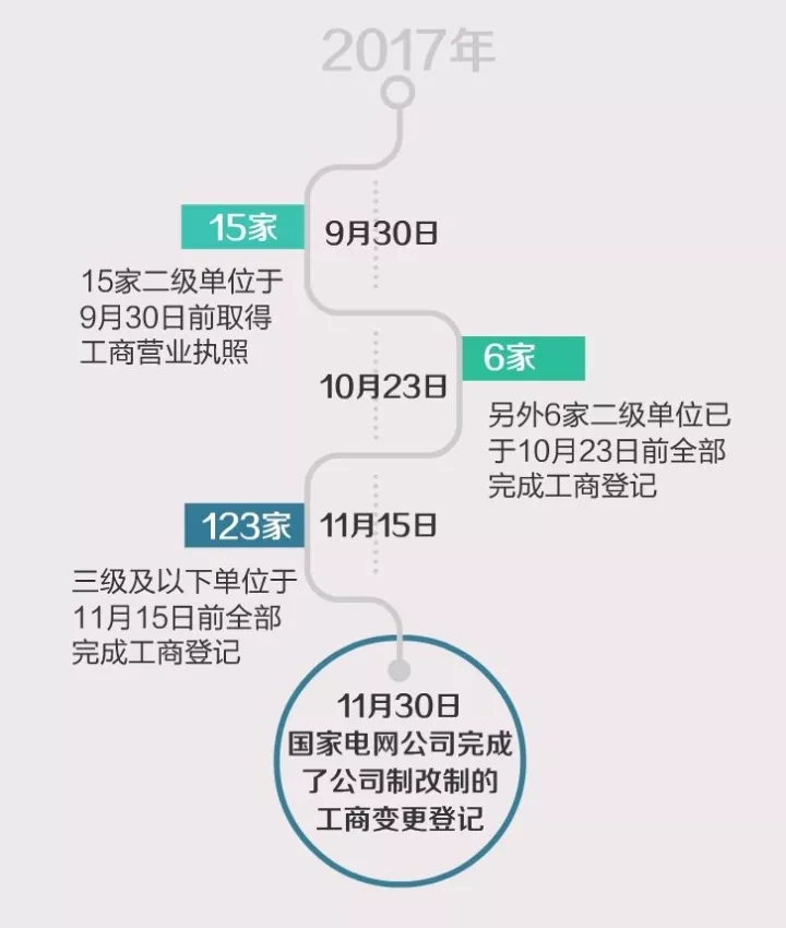 2017年11月30日,國(guó)家電網(wǎng)公司完成了公司制改制的工商變更登記。近日,國(guó)家電網(wǎng)取得改制后的工商營(yíng)業(yè)執(zhí)照。至此,國(guó)家電網(wǎng)總部和系統(tǒng)144家全民所有制企業(yè)實(shí)現(xiàn)華麗變身,全部提前完成公司制改制,由全民所有制企業(yè)