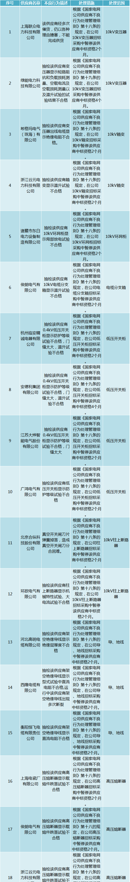 為促進(jìn)供應(yīng)商誠信履約,保證產(chǎn)品質(zhì)量,確保電網(wǎng)建設(shè)順利進(jìn)行及安全可靠供電,依據(jù)《國家電網(wǎng)公司供應(yīng)商不良行為處理管理細(xì)則》(以下簡稱《細(xì)則》)的有關(guān)規(guī)定,對出現(xiàn)重大產(chǎn)品質(zhì)量問題、履約不誠信等問題的供應(yīng)商進(jìn)行了處理。本次處理涉及10kv變壓器、高壓熔斷器等物資,具體處理情況如下: