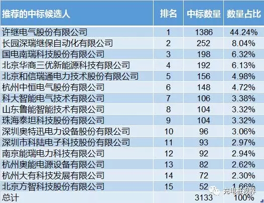 昨天,國家電網(wǎng)公布了2017年電源項目第五次物資招標(biāo)(第三批充電樁)采購中標(biāo)人信息,本次招標(biāo)共有15家公司幸運中標(biāo)。從數(shù)量上來看,許繼遙遙領(lǐng)先,共占據(jù)了總臺數(shù)的44 24%;從功率來看,排在前三位的分別是許繼