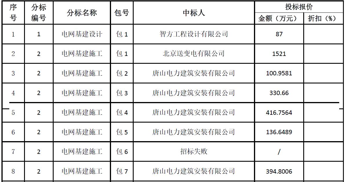 國(guó)網(wǎng)冀北電力有限公司2018年第一次電網(wǎng)工程及服務(wù)招標(biāo)采購(gòu)項(xiàng)目的中標(biāo)候選人公示已結(jié)束,現(xiàn)將中標(biāo)結(jié)果公告如下: