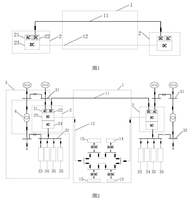 根據(jù)第一方面,本發(fā)明實(shí)施例提供了一種交直流混合微電網(wǎng)系統(tǒng),該交直流混合微電網(wǎng)系統(tǒng)包括:直流微電網(wǎng)和至少兩個(gè)柔性變電站;柔性變電站包括:高壓交流系統(tǒng)、高壓直流系統(tǒng)和低壓直流系統(tǒng),高壓交流系統(tǒng)與高壓直流系統(tǒng)之間、高壓直流系統(tǒng)與低壓直流系統(tǒng)之間、高壓交流系統(tǒng)與低壓直流系統(tǒng)之間分別相連;直流微電網(wǎng)包括:高壓直流母線(xiàn)和低壓直流母線(xiàn);各柔性變電站的高壓直流系統(tǒng)之間通過(guò)高壓直流母線(xiàn)相連,各柔性變電站的低壓直流系統(tǒng)之間通過(guò)低壓直流母線(xiàn)相連。