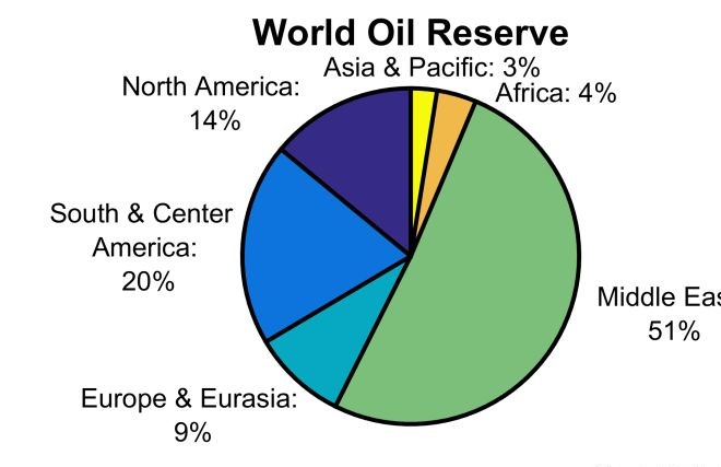 全球石油儲量相當(dāng)于2016年底的17067億桶(2407億噸)石油。就本研究確定的中東地區(qū)儲量而言,等于878億桶,占全球探明儲量的51.4%。中東地區(qū)的總?cè)丝诩s為4.5億。因此,該地區(qū)人均石油資源量為1951桶,儲量/產(chǎn)量比為70。圖2給出了2016年全球各地石油儲量的份額。